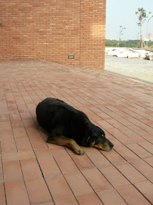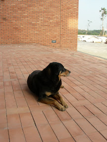 要進即將完成的科管院參觀啦..外面有個享受草原風光的狗, 請問你是牧羊犬嗎?